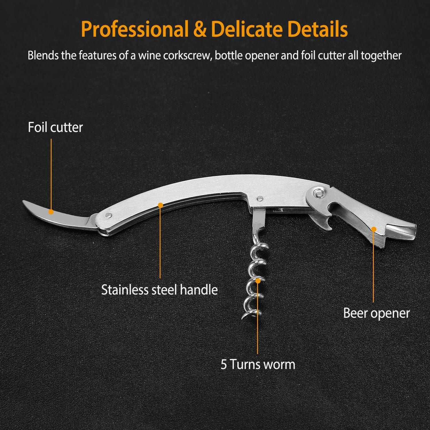 **3 IN 1 MULTIFUNCTIONAL WINE BOTTLE OPENER*:Our corkscrew elegantly blends the features of a wine corkscrew,bottle opener and foil cutter all together in a stylish and premium stainless steel and aluminum alloy body. It inspires confidence and offers the satisfying,solid heft of a fine tool and feels good in the hand,like a well-balanced kitchen knife.