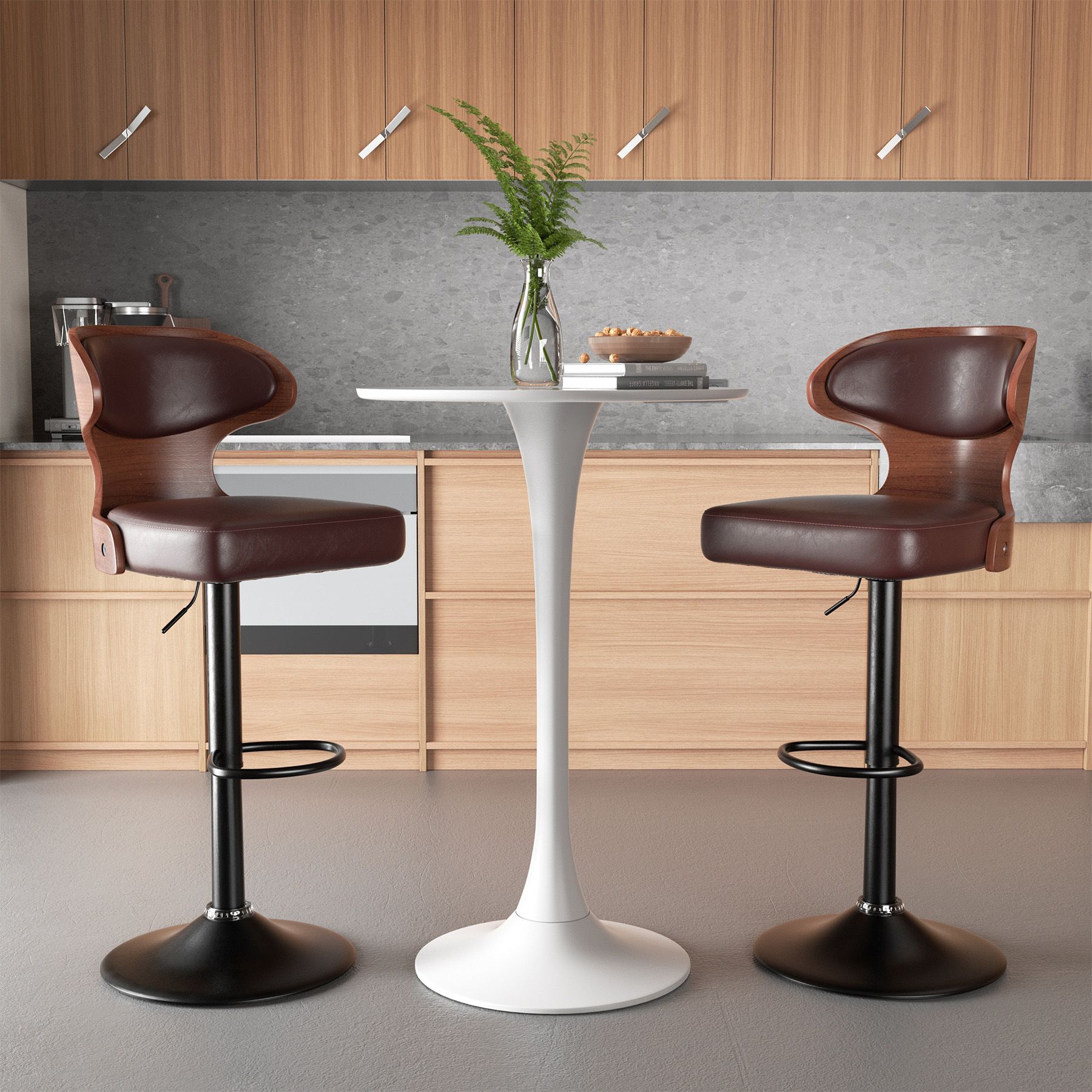 The 2-piece PU leather bar stool set features high-density foam and an L-shaped curved backrest
